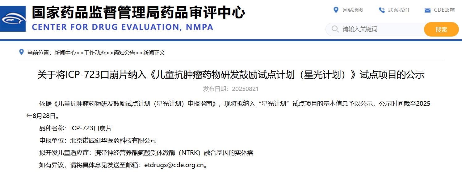 關(guān)于將ICP-723口崩片納入《兒童抗腫瘤藥物研發(fā)鼓勵試點計劃(星光計劃)》試點項目的公示