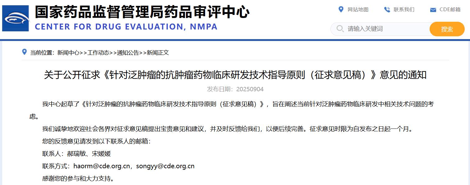 關(guān)于公開征求《針對(duì)泛腫瘤的抗腫瘤藥物臨床研發(fā)技術(shù)指導(dǎo)原則(征求意見稿)》意見的通知
