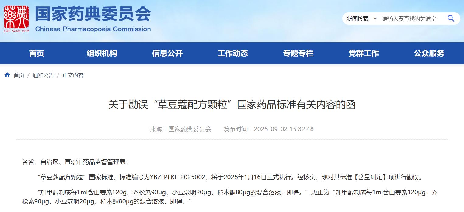 關(guān)于勘誤“草豆蔻配方顆粒”國(guó)家藥品標(biāo)準(zhǔn)有關(guān)內(nèi)容的函