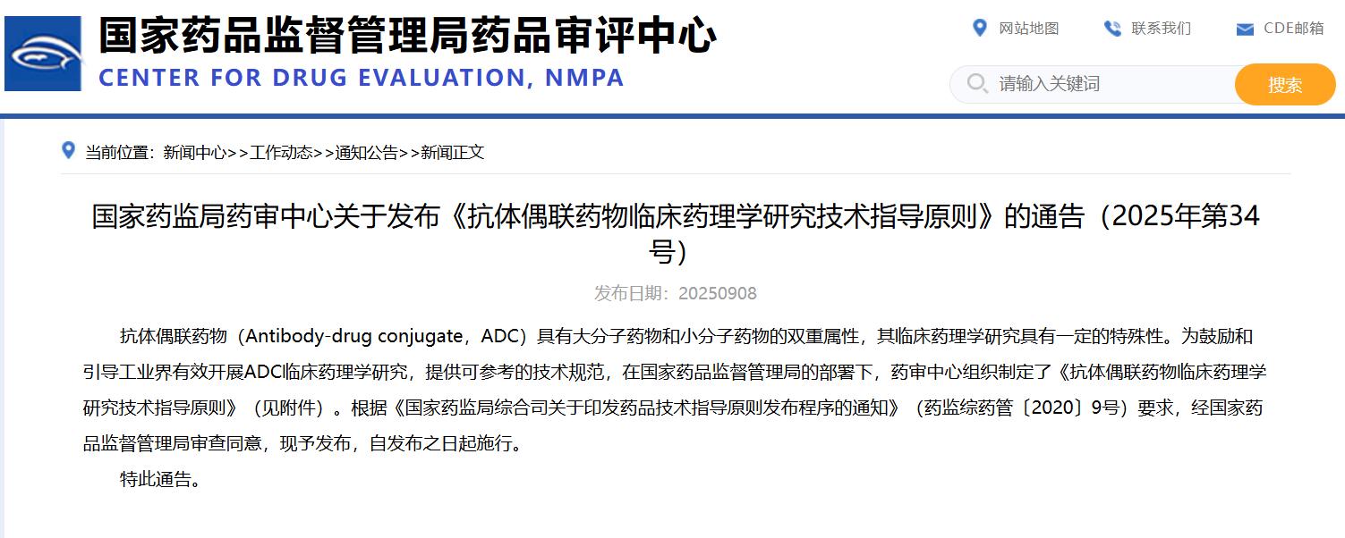 國家藥監(jiān)局藥審中心關于發(fā)布《抗體偶聯(lián)藥物臨床藥理學研究技術指導原則》的通告(2025年第34號)