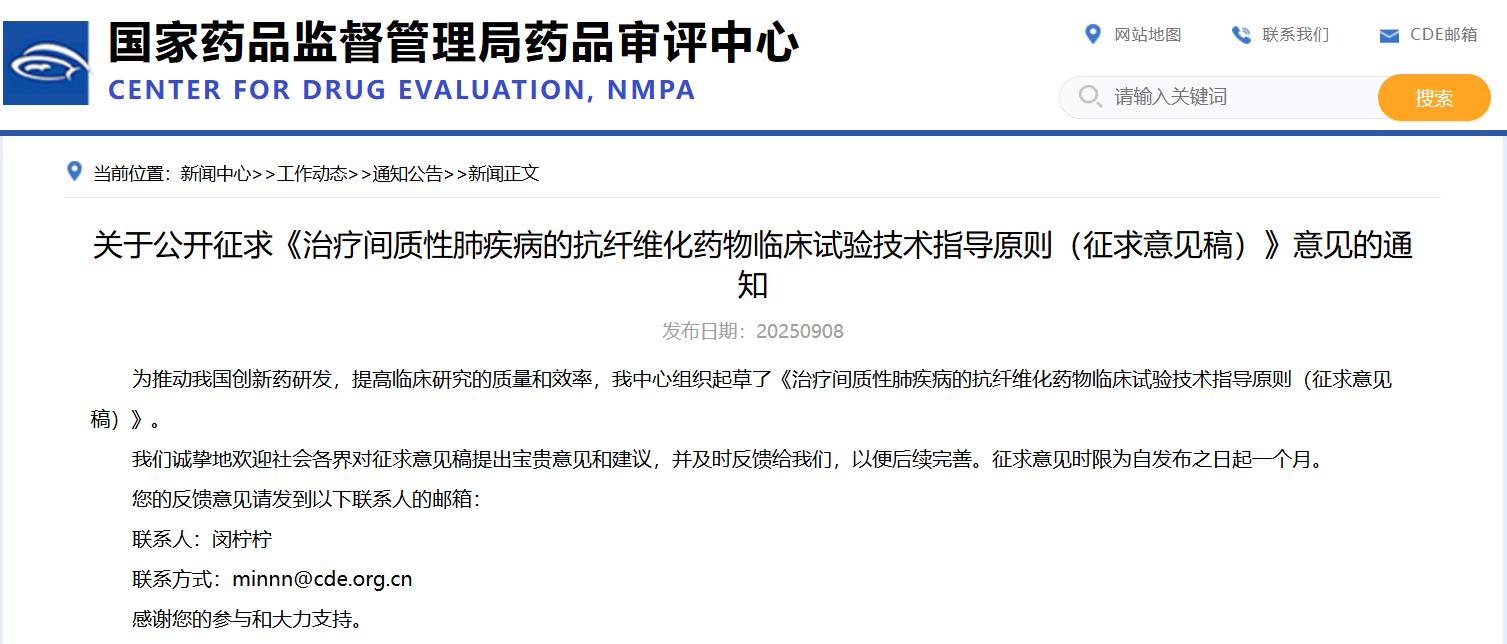 關于公開征求《治療間質(zhì)性肺疾病的抗纖維化藥物臨床試驗技術指導原則(征求意見稿)》意見的通知