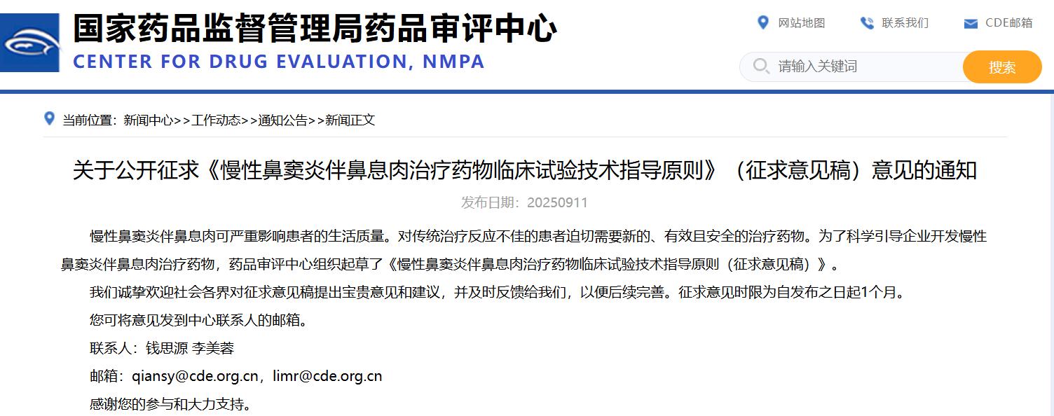 關于公開征求《慢性鼻竇炎伴鼻息肉治療藥物臨床試驗技術指導原則》(征求意見稿)意見的通知
