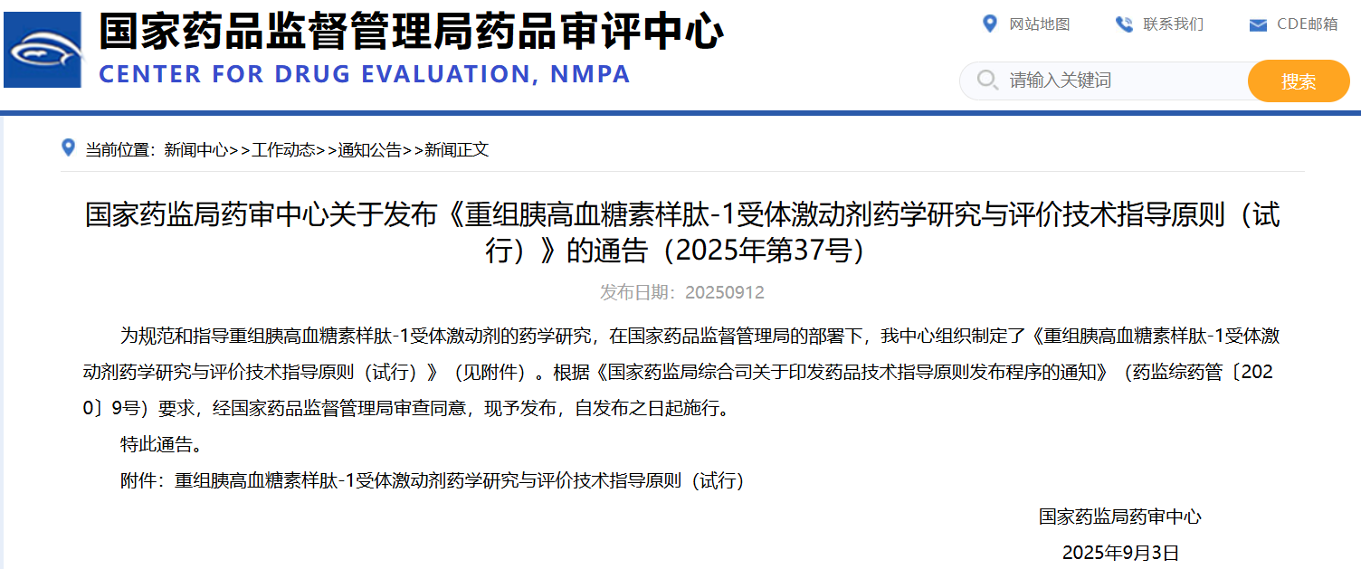 國家藥監(jiān)局藥審中心關于發(fā)布《重組胰高血糖素樣肽-1受體激動劑藥學研究與評價技術指導原則(試行)》的通告(2025年第37號)