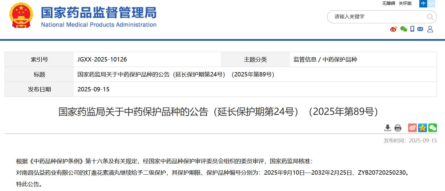 國家藥監(jiān)局關(guān)于中藥保護(hù)品種的公告(延長保護(hù)期第24號(hào))(2025年第89號(hào))
