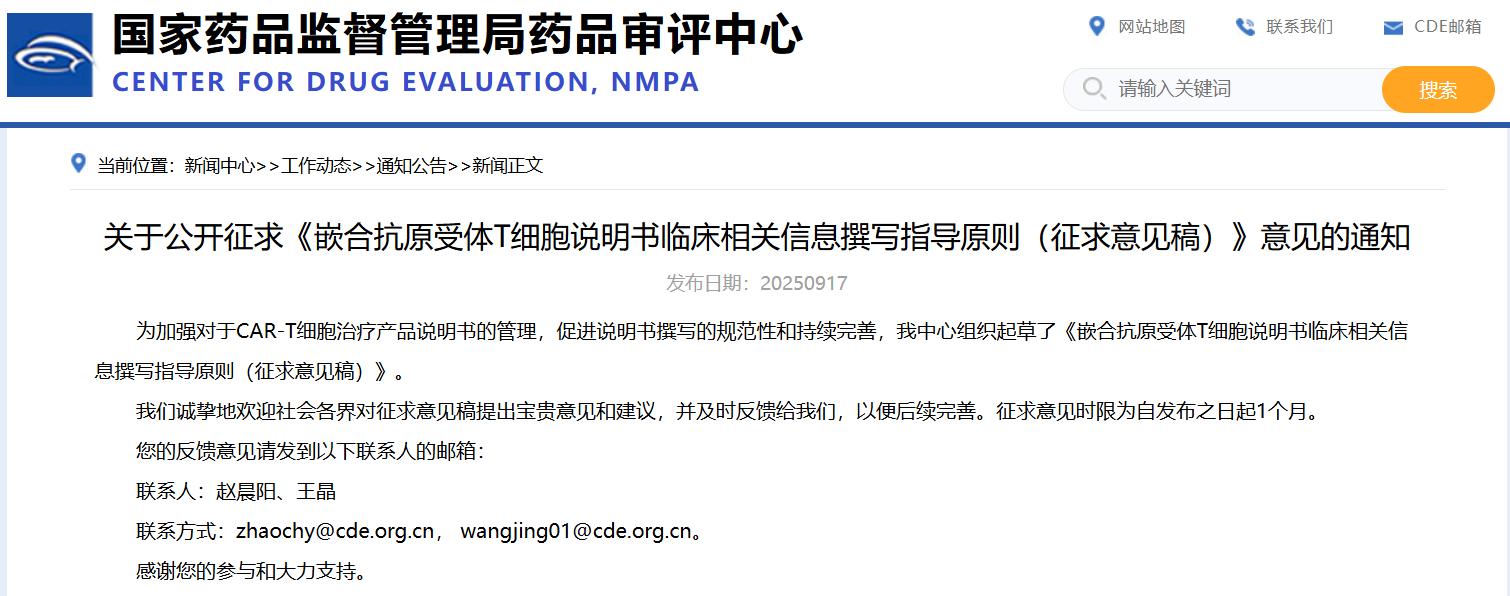關(guān)于公開征求《嵌合抗原受體T細(xì)胞說明書臨床相關(guān)信息撰寫指導(dǎo)原則(征求意見稿)》意見的通知