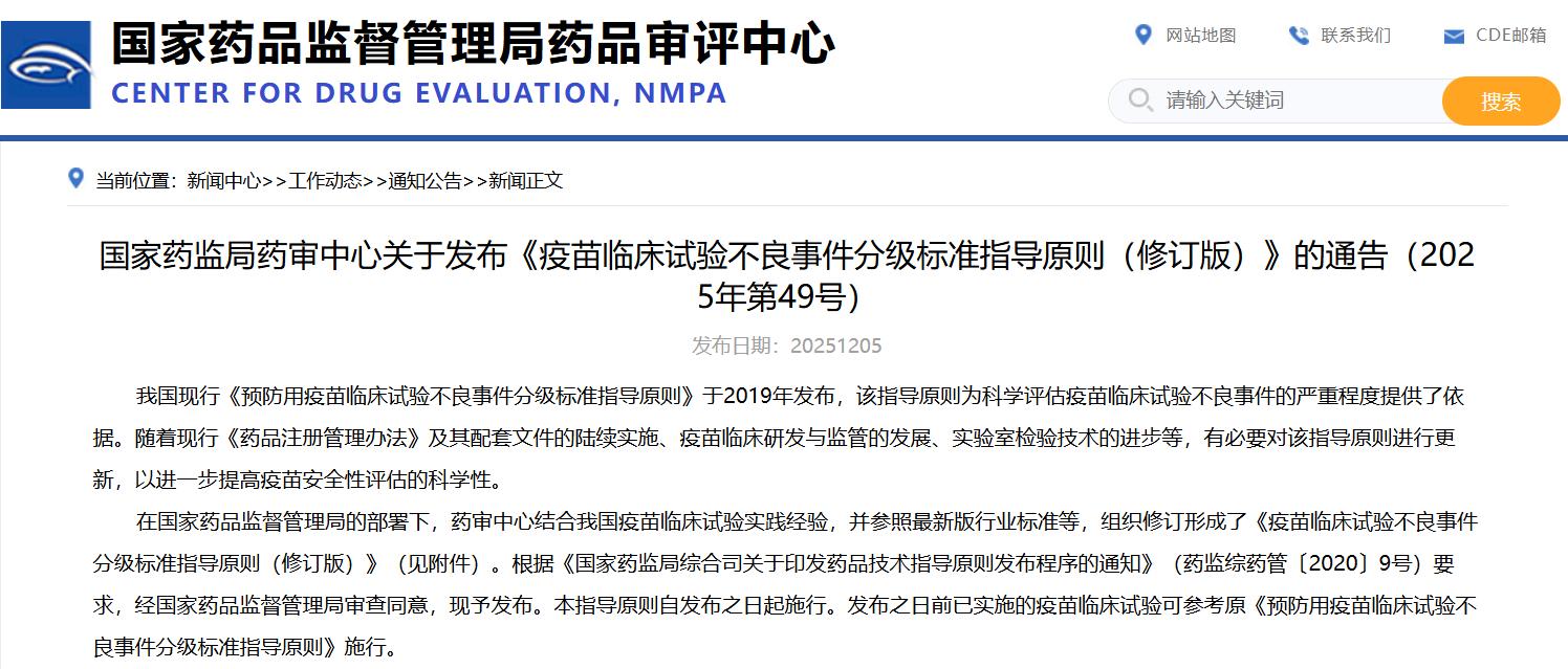 國家藥監(jiān)局藥審中心關(guān)于發(fā)布《疫苗臨床試驗不良事件分級標準指導(dǎo)原則(修訂版)》的通告(2025年第49號)