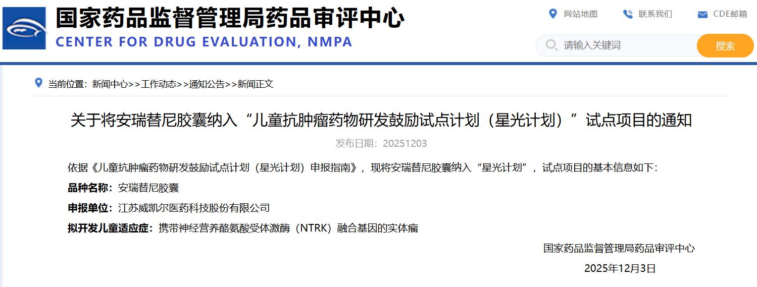 關(guān)于將安瑞替尼膠囊納入“兒童抗腫瘤藥物研發(fā)鼓勵試點計劃(星光計劃)”試點項目的通知