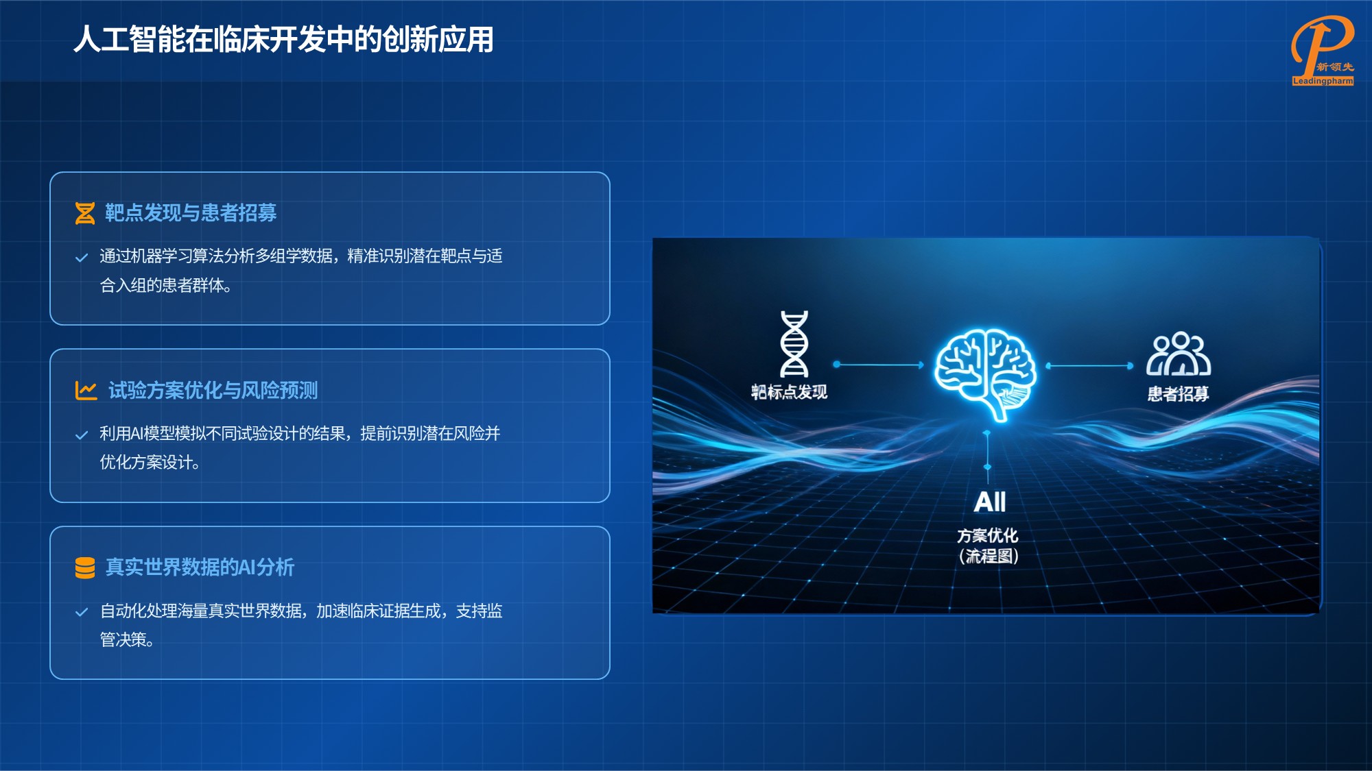 人工智能正為臨床開發(fā)帶來全方位創(chuàng)新變革。數(shù)據(jù)管理層面,AI 通過 NLP 技術(shù)實(shí)現(xiàn)非結(jié)構(gòu)化數(shù)據(jù)轉(zhuǎn)化,自動(dòng)化完成數(shù)據(jù)清洗、質(zhì)量控制與分析,合成數(shù)據(jù)技術(shù)突破隱私限制;試驗(yàn)執(zhí)行階段,AI 可輔助優(yōu)化試驗(yàn)方案、智能匹配招募患者、通過聊天機(jī)器人與可穿戴設(shè)備提升患者依從性,還能優(yōu)化研究中心資源分配等。
