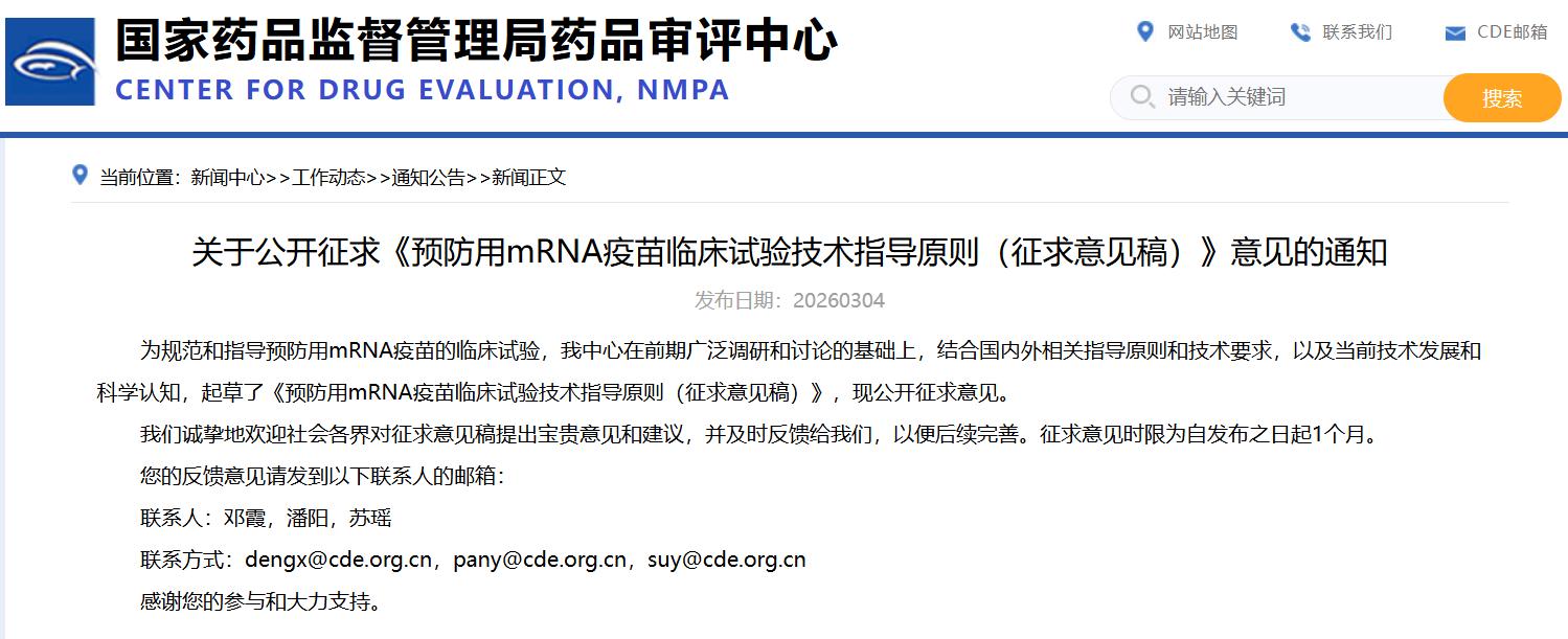關(guān)于公開征求《預(yù)防用mRNA疫苗臨床試驗(yàn)技術(shù)指導(dǎo)原則(征求意見稿)》意見的通知