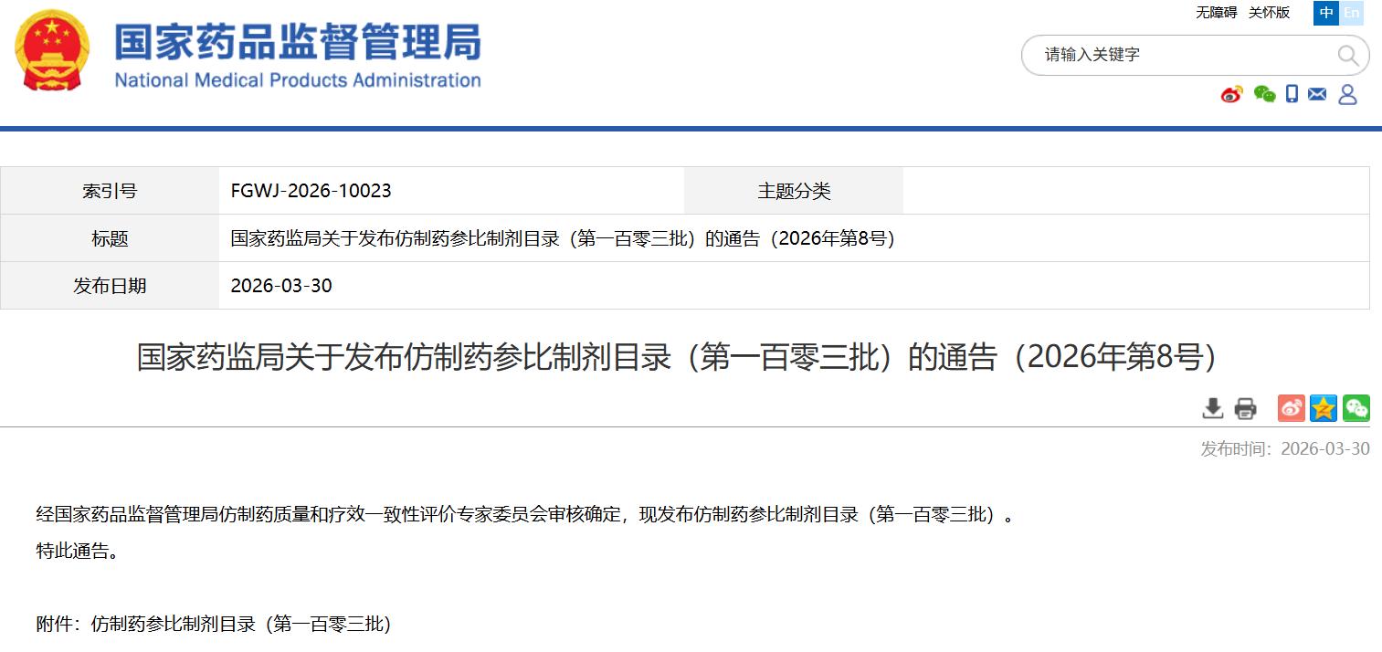 國(guó)家藥監(jiān)局關(guān)于發(fā)布仿制藥參比制劑目錄(第一百零三批)的通告(2026年第8號(hào))