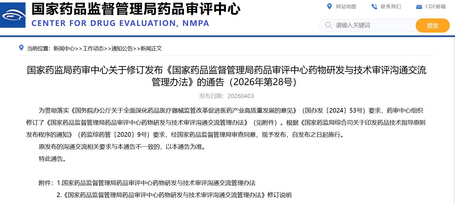 國(guó)家藥監(jiān)局藥審中心關(guān)于修訂發(fā)布《國(guó)家藥品監(jiān)督管理局藥品審評(píng)中心藥物研發(fā)與技術(shù)審評(píng)溝通交流管理辦法》的通告(2026年第28號(hào))