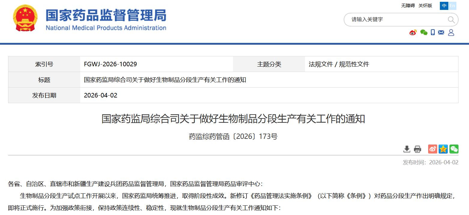 國(guó)家藥監(jiān)局綜合司關(guān)于做好生物制品分段生產(chǎn)有關(guān)工作的通知