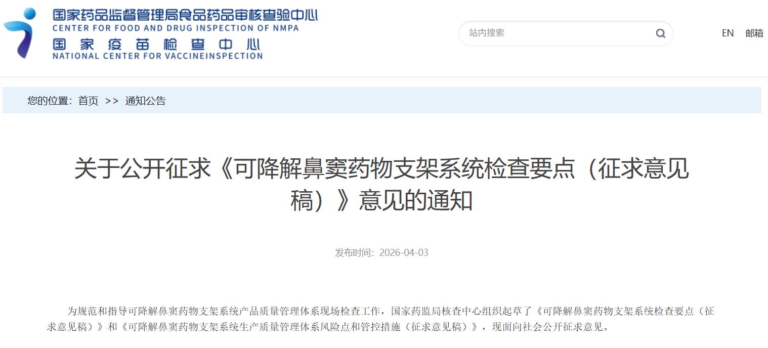 關(guān)于公開(kāi)征求《可降解鼻竇藥物支架系統(tǒng)檢查要點(diǎn)(征求意見(jiàn)稿)》意見(jiàn)的通知