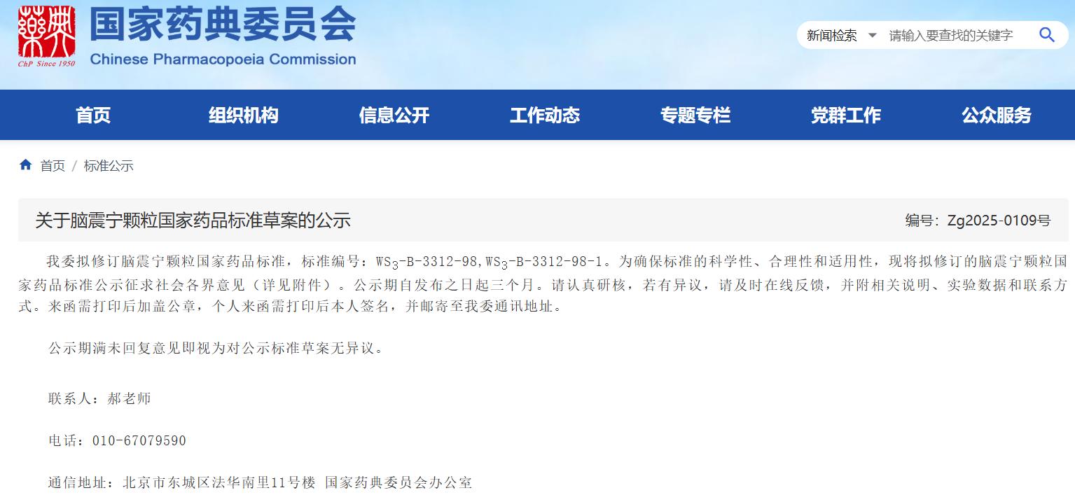 關(guān)于腦震寧顆粒國(guó)家藥品標(biāo)準(zhǔn)草案的公示