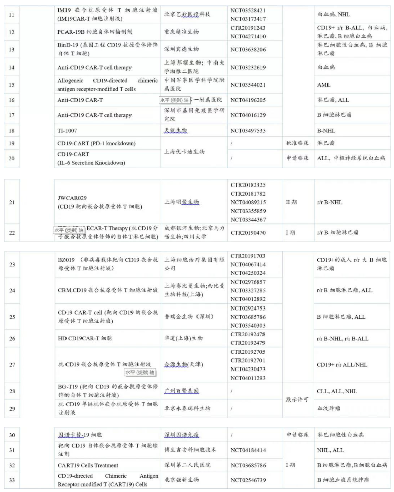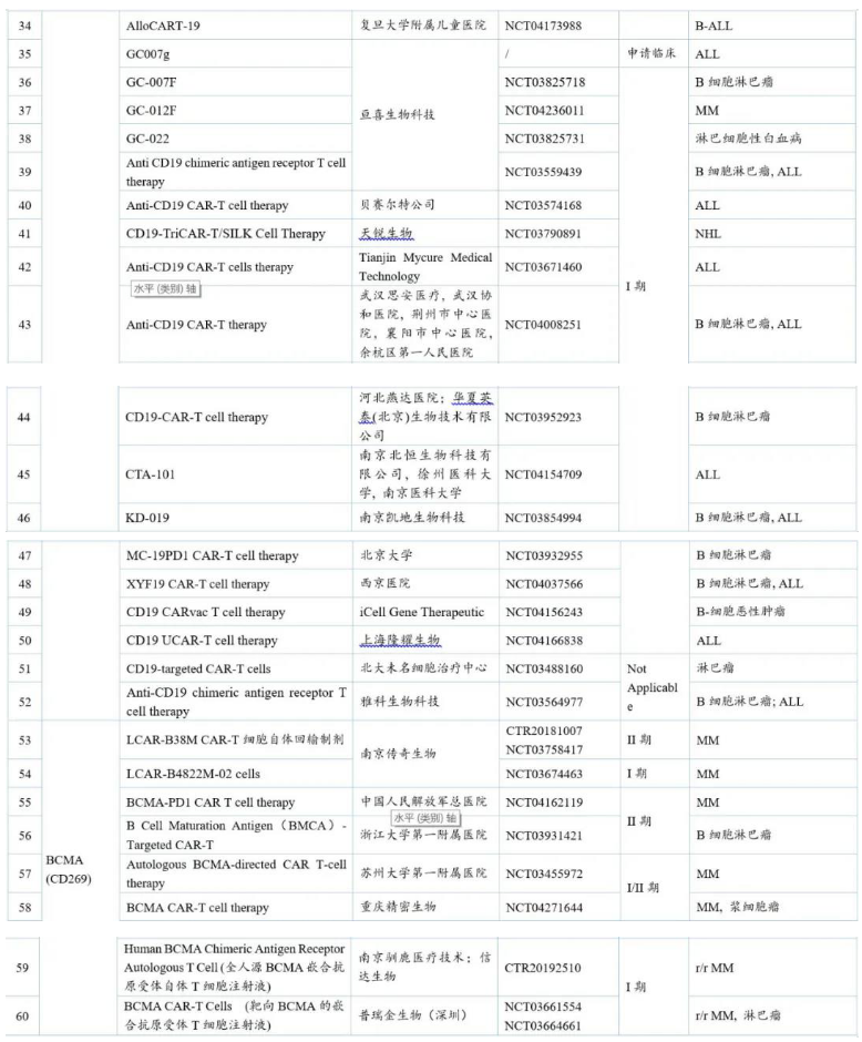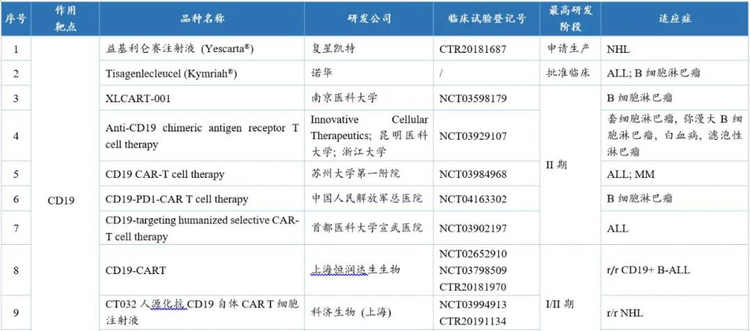 國內(nèi)針對CD19的CAR-T品種多達(dá)50余個,其中進(jìn)展最快的是國外已上市的Yescarta®,國內(nèi)暫定名為益基利侖賽注射液,目前已在國內(nèi)申請上市。此外,有5個中國1類品種處于臨床II期。