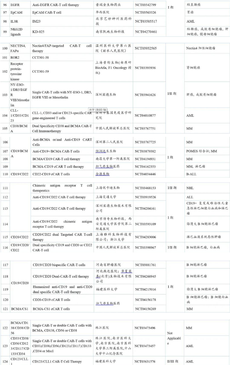 我們對上述148個臨床試驗對應(yīng)的在研品種進(jìn)行了分析與整合,并結(jié)合國內(nèi)臨床試驗注冊情況,最終共涉及131個CAR-T臨床在研品種,統(tǒng)計于下表中。