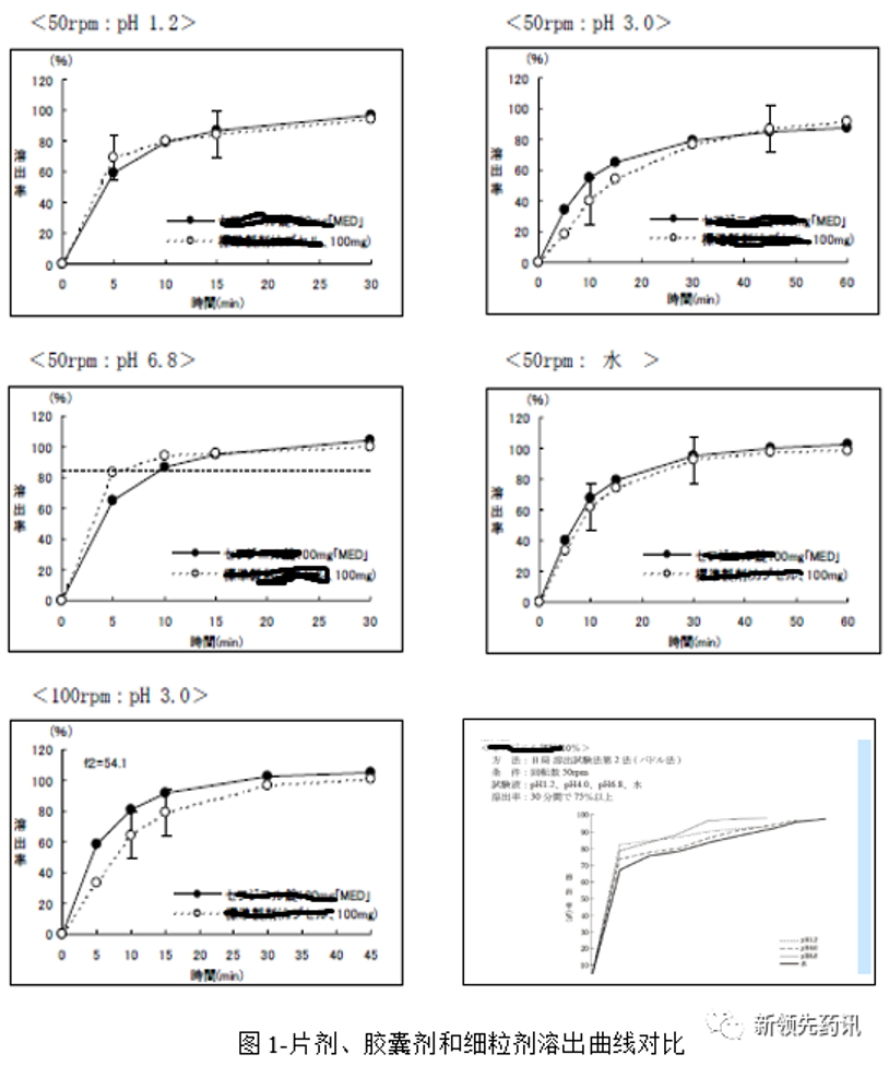 研究初期,通過對比日本上市的不同劑型,表明片劑、細(xì)粒劑、膠囊劑之間可能是生物等效的。細(xì)粒劑的處方組成設(shè)計與膠囊劑不同,其釋放速度更快。因此我們可以有把握地推測,分散片(快速體外行為)與膠囊劑具有生物等效性。