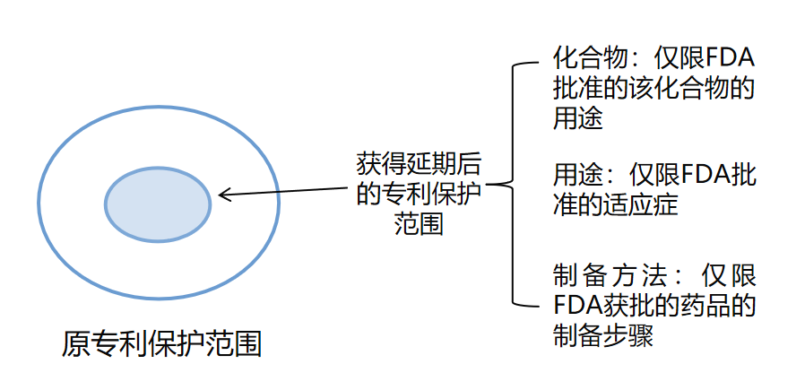 - (1)FDA批準(zhǔn)的藥品專(zhuān)利有效期延長(zhǎng)后的保護(hù)范圍小于原專(zhuān)利要求保護(hù)的范圍,如下圖所示: