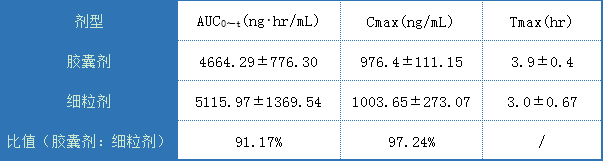 從日本IF文件中,并沒(méi)有直接獲得膠囊劑和細(xì)粒劑的藥動(dòng)學(xué)參數(shù)對(duì)比,但我們從日本某公司的仿制藥IF文件中,可分別獲得仿制的膠囊與原研膠囊的藥動(dòng)學(xué)對(duì)比,以及仿制的細(xì)粒劑與原研細(xì)粒劑的藥動(dòng)學(xué)對(duì)比,具體如下: