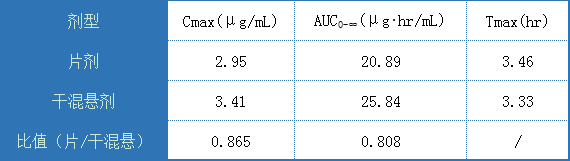 上表給出了給藥劑量均為200mg的前提下,片劑、糖漿、干混懸劑之間的藥動(dòng)學(xué)參數(shù)對(duì)比,由于糖漿劑劑型比較復(fù)雜,受糖漿粘度影響,可能影響體內(nèi)吸收,暫不做考慮,單純對(duì)比片劑以及干混懸劑的藥動(dòng)學(xué)參數(shù),如下: