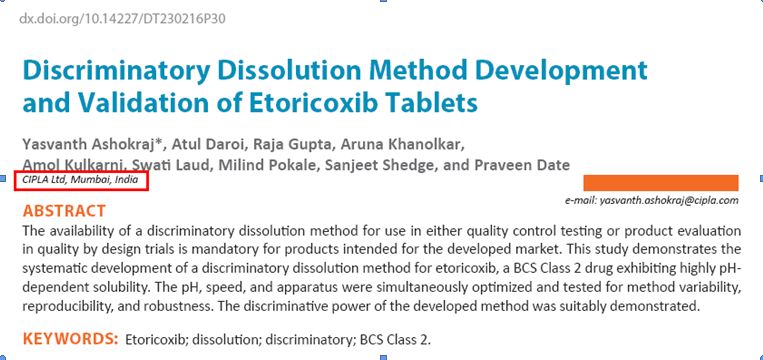2016年,印度同仁對溶出度技術(shù)的運(yùn)用已日趨成熟,開始公開撰文?!度艹龆仍囼?yàn)技術(shù)雜志(DissolutionTechnologies)》在該年5月發(fā)表了一篇由印度CIPLA公司研發(fā)人員撰寫的“以依托考昔片為例:如何開發(fā)適度區(qū)分力的溶出方法”文章。
