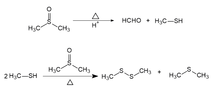 查詢二甲基亞砜穩(wěn)定性相關文獻,報道二甲基亞砜在酸性條件下高溫加熱會發(fā)生分解,分解產(chǎn)物主要是甲硫醚(沸點38℃)、二甲基二硫醚(沸點109℃)和甲硫醇(沸點123℃)。