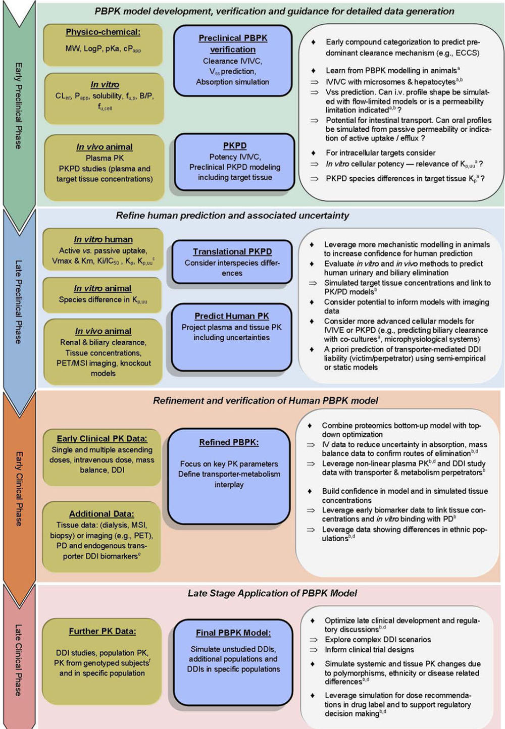 因?yàn)樵谀承┨囟ńM織器官中,該模型使用了特定的參數(shù)和微分方程,這也使得在一些藥物并用或聯(lián)合給藥治療的情況下,可以去預(yù)測(cè)有無誘導(dǎo)劑或抑制劑存在情形的特殊族群藥代動(dòng)力學(xué)特點(diǎn),這為其在新藥研發(fā)策略的提供、臨床試驗(yàn)方案的設(shè)計(jì)和臨床試驗(yàn)成功率的提高方面提供了重要參考價(jià)值和指導(dǎo)意見。來自禮來,默克,羅氏等國(guó)際制藥先端企業(yè)的科學(xué)家也為PBPK建模在公司新藥研發(fā)應(yīng)用的流程做出了詳細(xì)歸納和總結(jié)[4]。