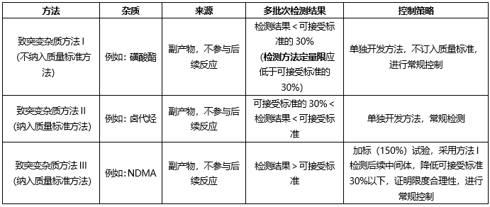 我們開發(fā)致突變雜質(zhì)相關方法檢測上述致突變雜質(zhì),雜質(zhì)控制策略如下: