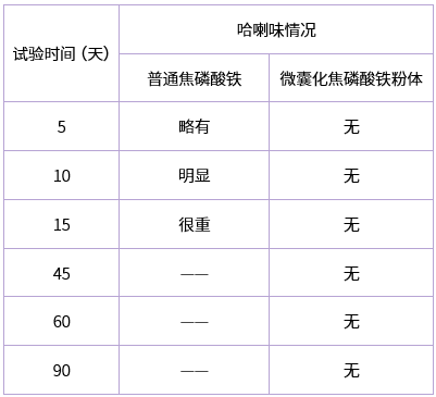 5.將普通的焦磷酸鐵與微囊化焦磷酸鐵粉體分別與豆粉按相同比例進(jìn)行混合,放在相同條件(恒溫恒濕箱內(nèi),設(shè)定溫度40℃,濕度70%)下,定期取樣。