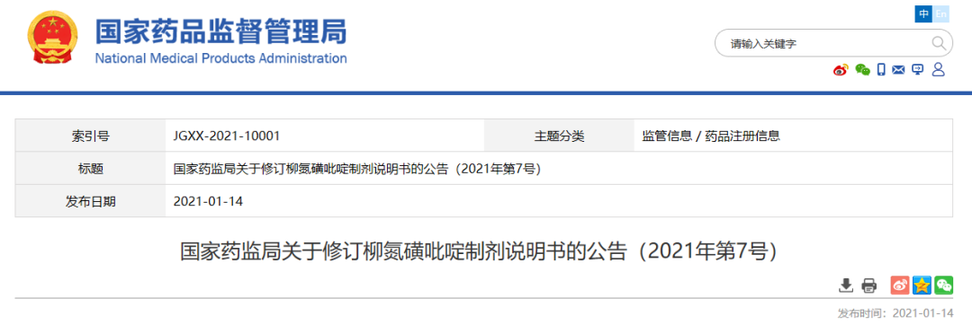 關(guān)于修訂柳氮磺吡啶制劑說明書的公告(2021年第7號(hào))