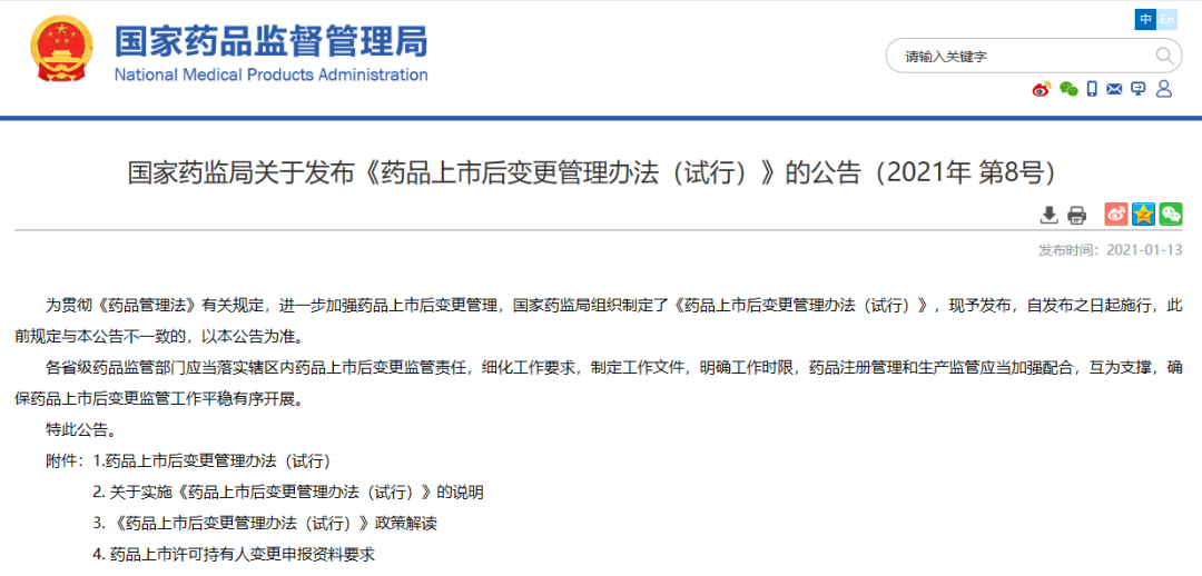 關(guān)于發(fā)布《藥品上市后變更管理辦法(試行)》的公告(2021年第8號(hào))