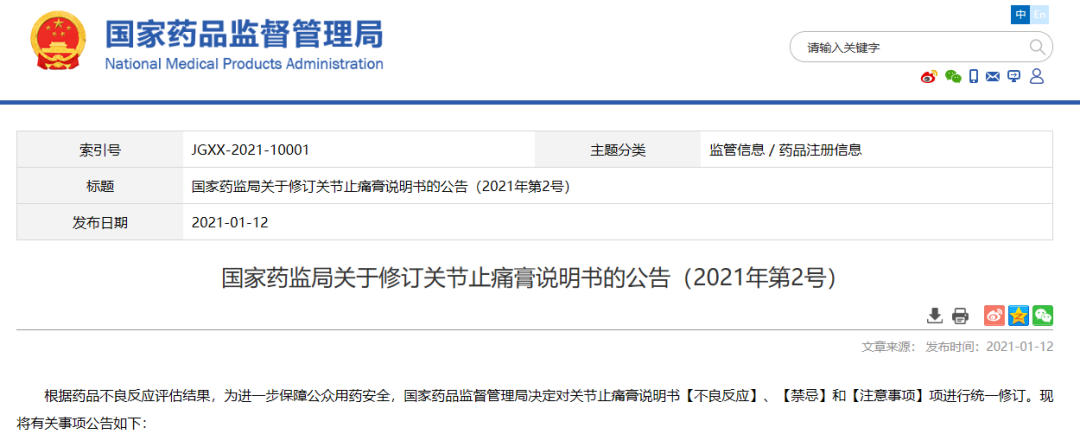 關(guān)于修訂關(guān)節(jié)止痛膏說明書的公告(2021年第2號(hào))