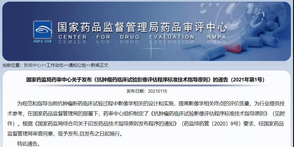 關(guān)于發(fā)布《抗腫瘤藥臨床試驗(yàn)影像評(píng)估程序標(biāo)準(zhǔn)技術(shù)指導(dǎo)原則》的通告(2021年第1號(hào))