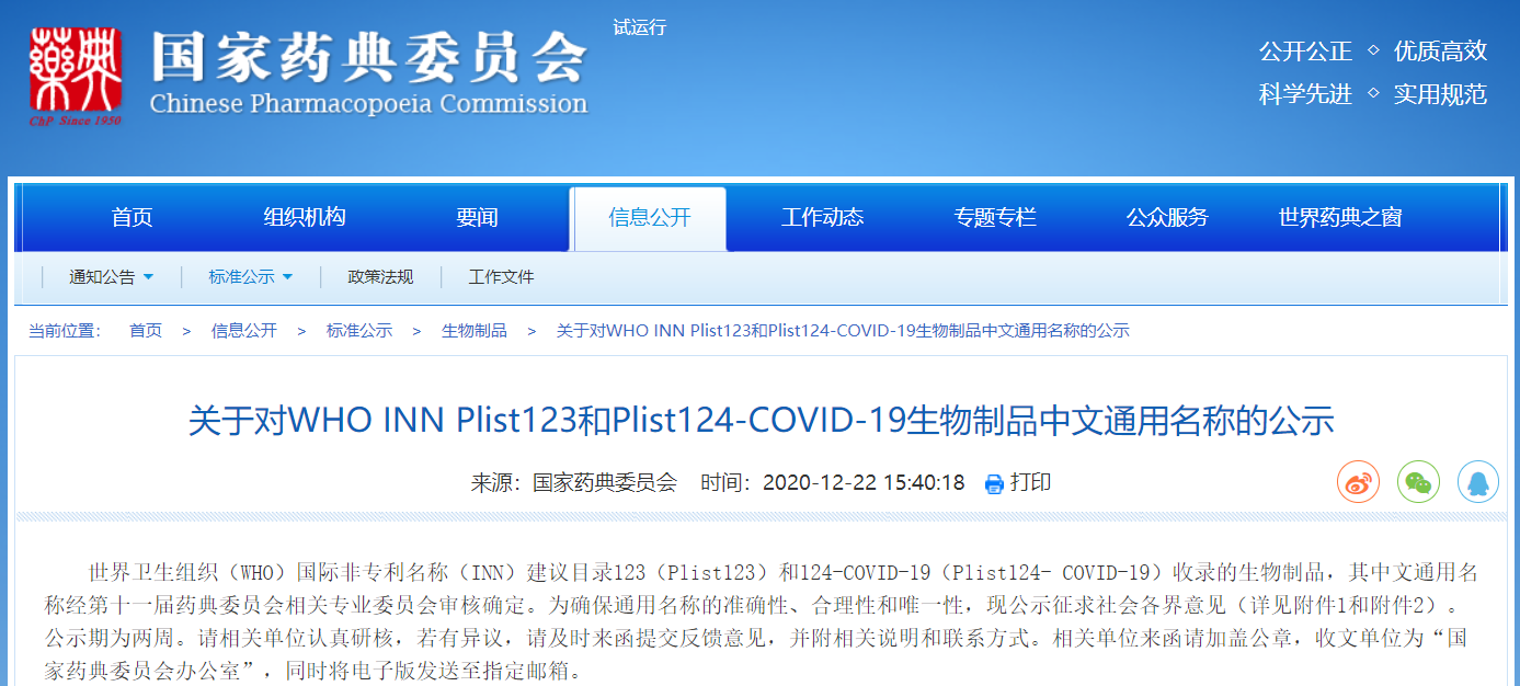 關(guān)于對(duì)WHO INN Plist123和Plist124-COVID-19生物制品中文通用名稱的公示