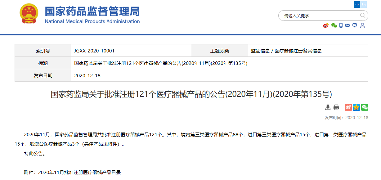 關(guān)于批準(zhǔn)注冊121個醫(yī)療器械產(chǎn)品的公告(2020年11月)(2020年第135號)
