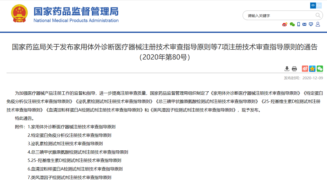 關(guān)于發(fā)布家用體外診斷醫(yī)療器械注冊技術(shù)審查指導(dǎo)原則等7項注冊技術(shù)審查指導(dǎo)原則的通告(2020年第80號)
