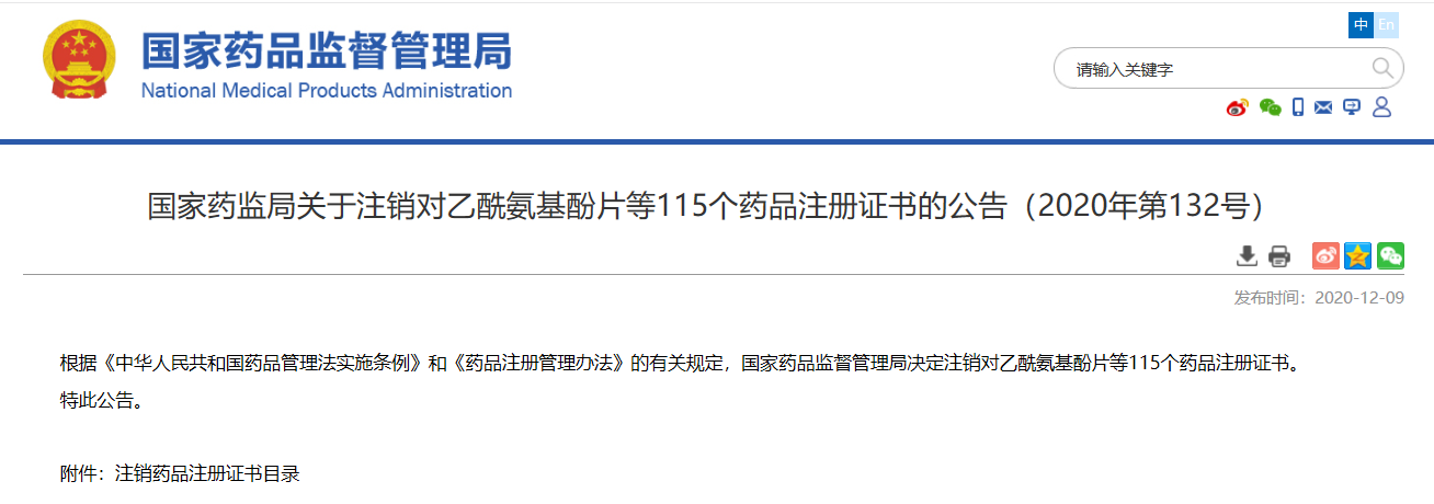 關(guān)于注銷對乙酰氨基酚片等115個藥品注冊證書的公告(2020年第132號)