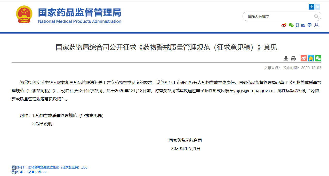 規(guī)范藥品上市許可持有人藥物警戒主體責(zé)任,國家藥品監(jiān)督管理局起草了《藥物警戒質(zhì)量管理規(guī)范(征求意見稿)》,.適用于藥品的非臨床研究、臨床試驗(yàn)、生產(chǎn)經(jīng)營、上市后研究、不良反應(yīng)監(jiān)測及報告與處理等,現(xiàn)向社會公開征求意見,時間截止至2020.12.28。