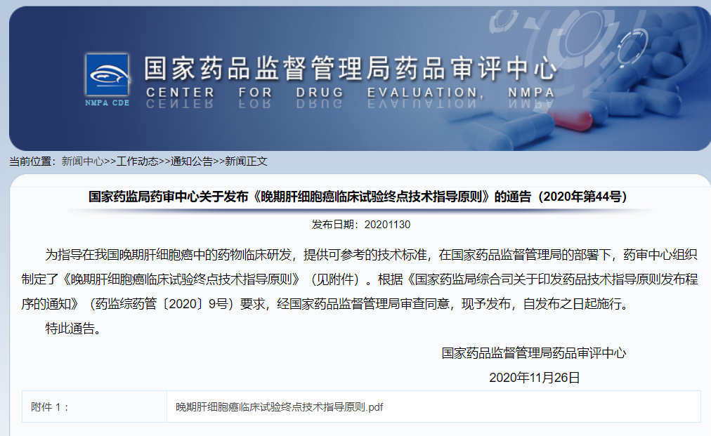 關(guān)于發(fā)布《晚期肝細(xì)胞癌臨床試驗(yàn)終點(diǎn)技術(shù)指導(dǎo)原則》的通告(2020年第44號)