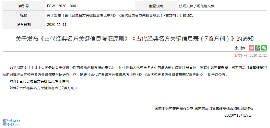 關(guān)于《古代經(jīng)典名方關(guān)鍵信息考證原則》《古代經(jīng)典名方關(guān)鍵信息表(7首方劑)》的發(fā)布。