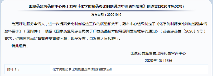 ? 國(guó)家藥監(jiān)局藥審中心關(guān)于發(fā)布《化學(xué)仿制藥參比制劑遴選申請(qǐng)資料要求》的通告(2020年第32號(hào))