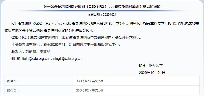 ? 關(guān)于公開(kāi)征求ICH指導(dǎo)原則《Q3D(R2):元素雜質(zhì)指導(dǎo)原則》意見(jiàn)的通知