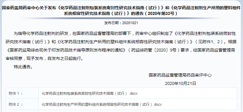 ? 國(guó)家藥監(jiān)局藥審中心關(guān)于發(fā)布《化學(xué)藥品注射劑包裝系統(tǒng)密封性研究技術(shù)指南(試行)》和《化學(xué)藥品注射劑生產(chǎn)所用的塑料組件系統(tǒng)相容性研究技術(shù)指南(試行)》的通告(2020年第33號(hào))