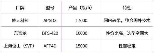 國(guó)內(nèi)生產(chǎn)BFS線的制造商主要有楚天科技、上海東富龍、上海位山等。主要型號(hào)及生產(chǎn)能力如下表所示(以2~5ml灌裝量為例):
