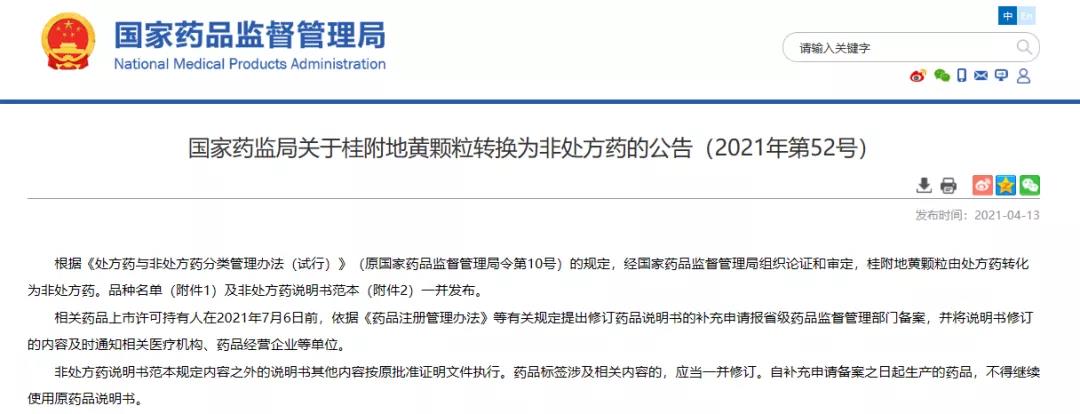國家藥監(jiān)局關(guān)于桂附地黃顆粒轉(zhuǎn)換為非處方藥的公告(2021年第52號)