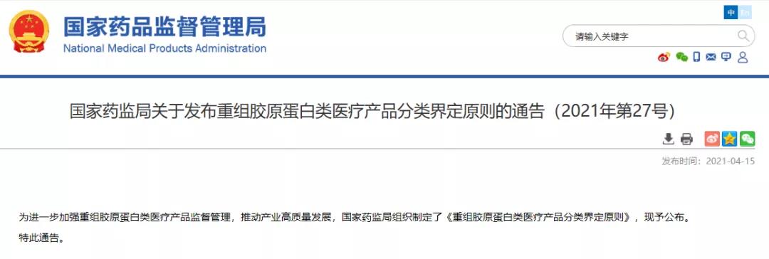 國家藥監(jiān)局關(guān)于發(fā)布重組膠原蛋白類醫(yī)療產(chǎn)品分類界定原則的通告(2021年第27號)