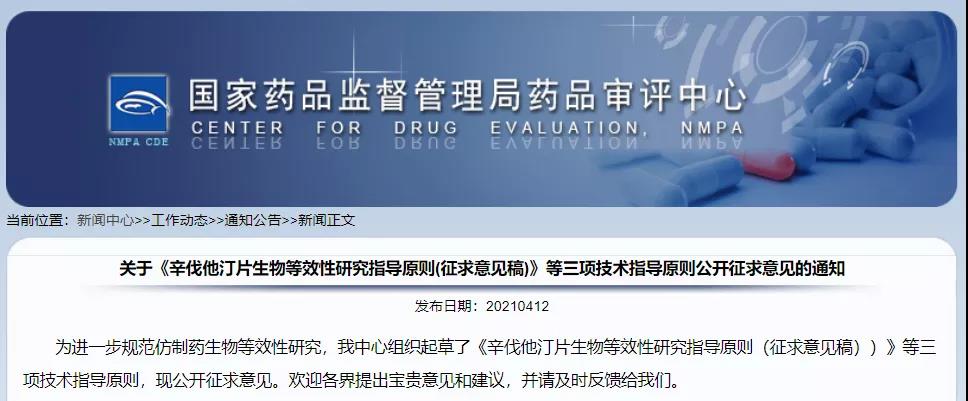 關(guān)于《辛伐他汀片生物等效性研究指導(dǎo)原則(征求意見稿)》等三項技術(shù)指導(dǎo)原則公開征求意見的通知