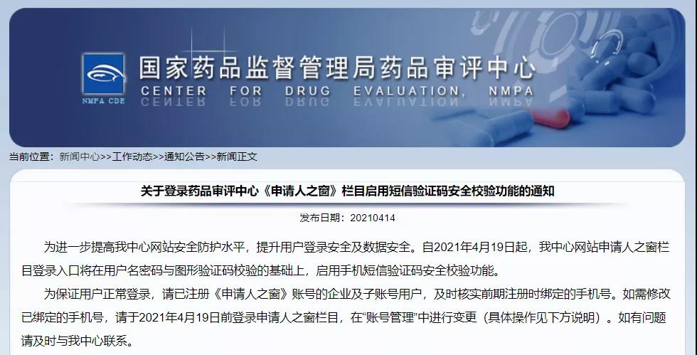 關(guān)于登錄藥品審評中心《申請人之窗》欄目啟用短信驗證碼安全校驗功能的通知