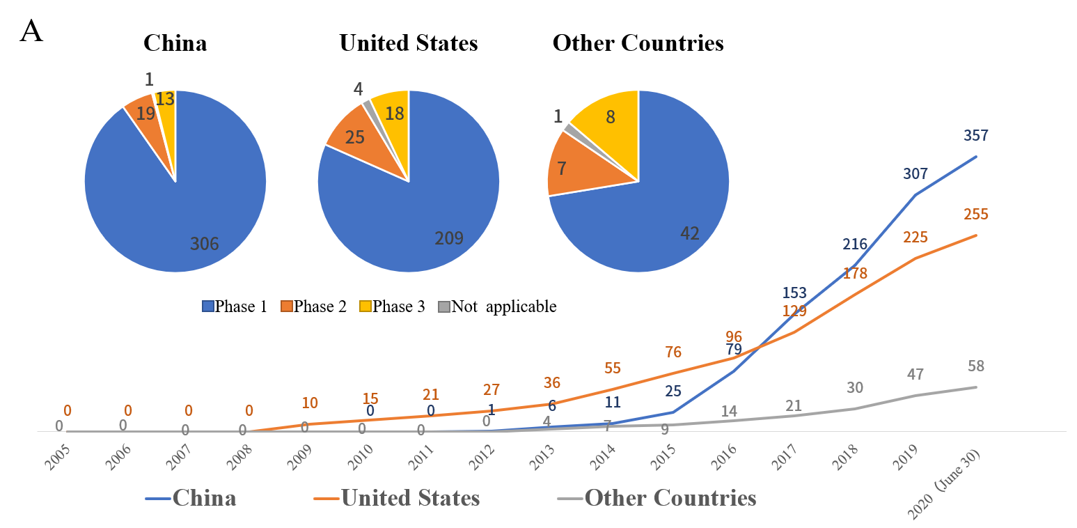 在中國(guó)的357項(xiàng)臨床試驗(yàn)中,有306項(xiàng)屬于I期研究,有19項(xiàng)屬于II期研究,有1項(xiàng)進(jìn)入了III期研究(于2020年注冊(cè));在美國(guó)的256個(gè)臨床試驗(yàn)中,I期、II期和III期試驗(yàn)的數(shù)量分別為209、25和4;在其他國(guó)家/地區(qū)的58項(xiàng)臨床試驗(yàn)中,I期、II期和III期試驗(yàn)的數(shù)量分別為42、7和1[1]。