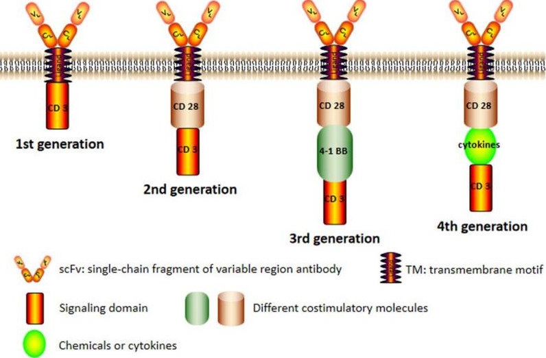 圖2:四代嵌合抗原受體(CAR)的結(jié)構(gòu)[2]